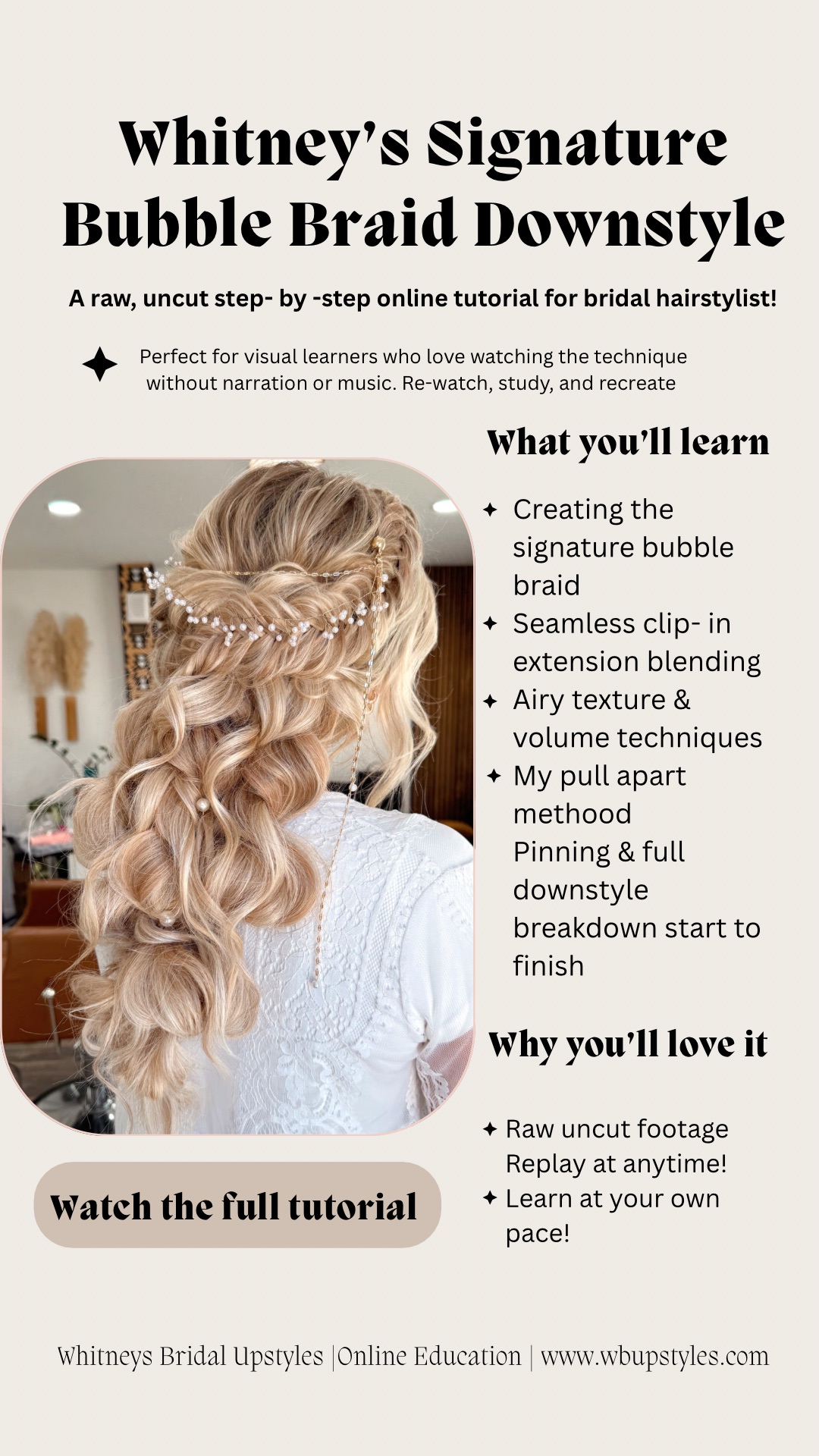 Ready to elevate your bridal styling game? This in-depth tutorial teaches you my full Signature Bubble Braid Downstyle — the same dreamy, textured, boho-inspired look that books brides instantly.
